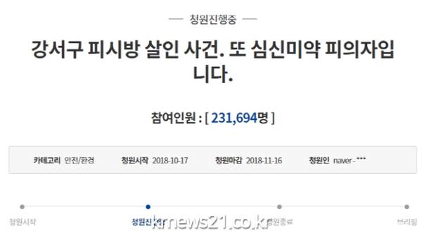 지난 17일 청와대 국민청원 게시판에는 ‘강서구 PC방 살인 사건, 또 심신미약 피의자’라는 제목의 청원이 게재됐다.