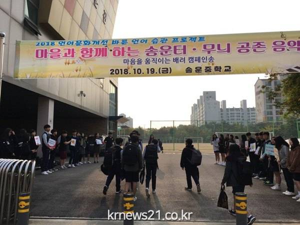 시흥 송운중학교(교장 김용오)에서는 2018년 10월 19일 금요일 14:35∼16:15까지 송운중학교 교문 밖 풀잎사랑공원에서 1학년 인성동아리가‘마음을 움직이는 배려 캠페인 송’대회를 진행할 예정이다.
