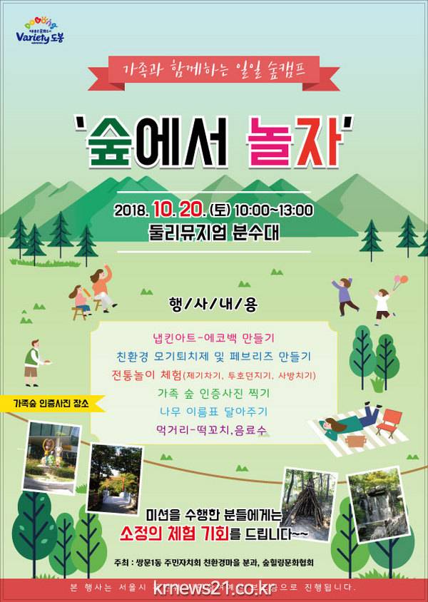 친환경 숲캠프 ‘숲에서 놀자’에서는 쌍문근린공원 숲 일대를 돌아다니며 인증샷을 찍어오는 ‘가족숲 인증사진 찍기’, 냅킨아트로 ‘에코백 만들기’, 친환경 페브리즈 및 모기퇴치제 만들기, 전통놀이, 나무 이름표 달아주기 등 다양한 친환경 숲체험 프로그램으로 구성됐다.
