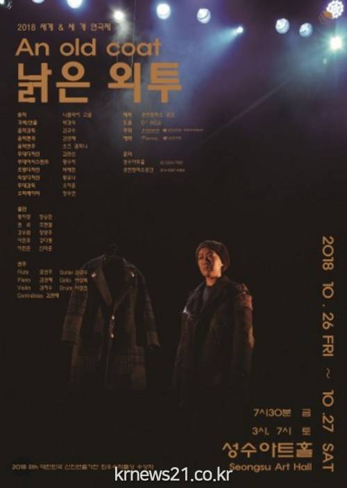 연극 낡은 외투는 26일, 27일 성수아트홀에서 만나 볼 수 있다. 예매는 성동문화재단 홈페이지와 인터파크 예매사이트를 통해 가능하다.