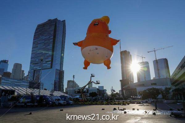 ▲ REUTERS/Mike Blake[제공자ⓒ 뉴스21통신. 무단전재-재배포 금지.]19일(현지시간) 미국 로스앤젤레스(LA) 컨벤션센터에서 열리는 '폴리티콘'(Politicoin) 홍보를 위해 설치된 대형 트럼프 대형 풍선.
