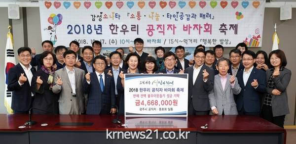 광주시(시장 신동헌)는 ‘공직자 감성 소나타’의 일환으로 개최한 ‘2018년 한우리 공직자 바자회 축제’ 수익금 전액을 기탁했다고 23일 밝혔다.