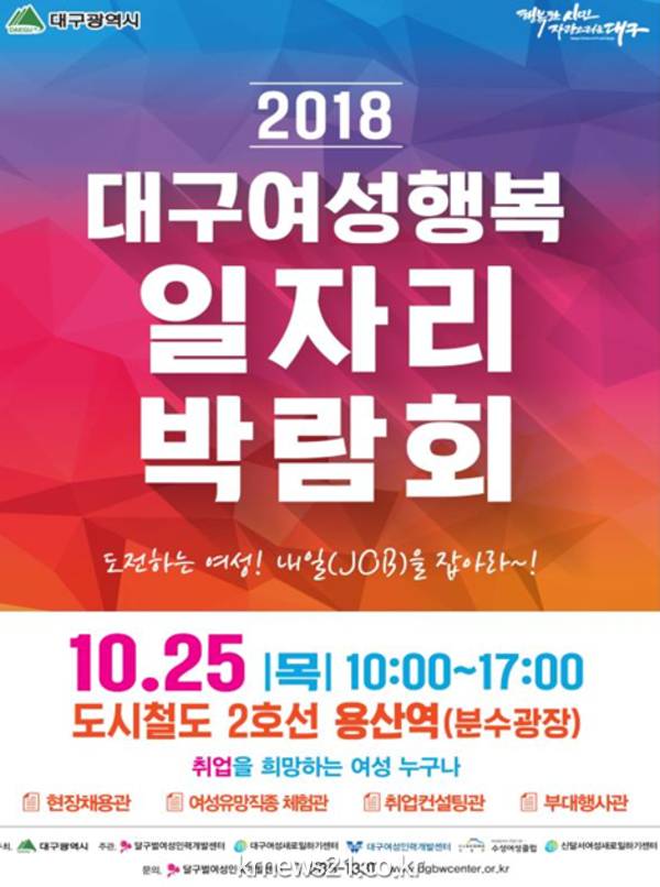 ▲ (사진=대구광역시청)대구시 거주 미취업여성들에게 취․창업 기회를 제공하기 위한『2018대구여성 행복일자리 박람회』가 10월 25일(목) 오전 10시부터 오후 5시까지 도시철도2호선 용산역(분수광장)에서 개최 된다.