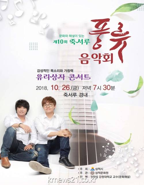 이번「죽서루 풍류음악회」에서는 감성적인 목소리와 가창력의 ‘유리상자(박승화, 이세준)’가 출연하여 감미로운 무대를 선사한다.