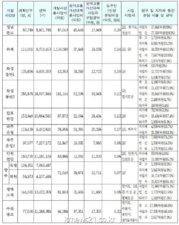 국회 국토교통위원회 소속 홍철호 의원이 국토교통부로부터 제출받은 자료에 따르면, 2기 신도시 10곳에 대한 광역교통개선대책 총사업비는 31조 3900억원이었으며 이 중 56.7%인 17조 8063억원을 LH 등의 사업시행자가 부담한 것으로 확인됐다. 사업시행자의 교통부담금은 토지조성원가에 포함돼 최종 분양가에 반영되기 때문에 입주자들이 내는 부담금으로 본다. 즉 17조 8063억원을 2기 신도시 입주자들이 부담한 것이다.