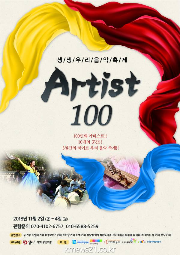2018 경기 전통문화 활성화 사업의 일환으로 경기도, 화성시, 화성시 문화재단, 경기문화재단, 한국문화예술위원회가 후원하고 사회적 기업 문화발전소 열터와 사단법인 화성민예총이 주최, 주관하는 <</span>생생 우리음악축제 Artist100>이 오는 11월 2일부터 4일까지 3일간 개최된다.