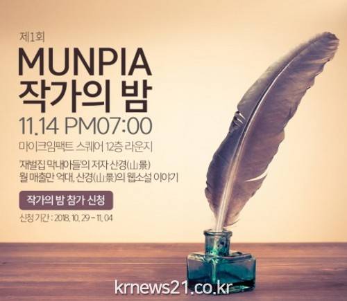 웹소설 연재 플랫폼 문피아가 11월 14일 ‘재벌집 막내아들’의 저자 산경(山景)을 초청해 웹소설을 주제로 예비 및 기성 작가와 이야기를 나누는 토크 콘서트 ‘작가의 밤’을 개최한다.