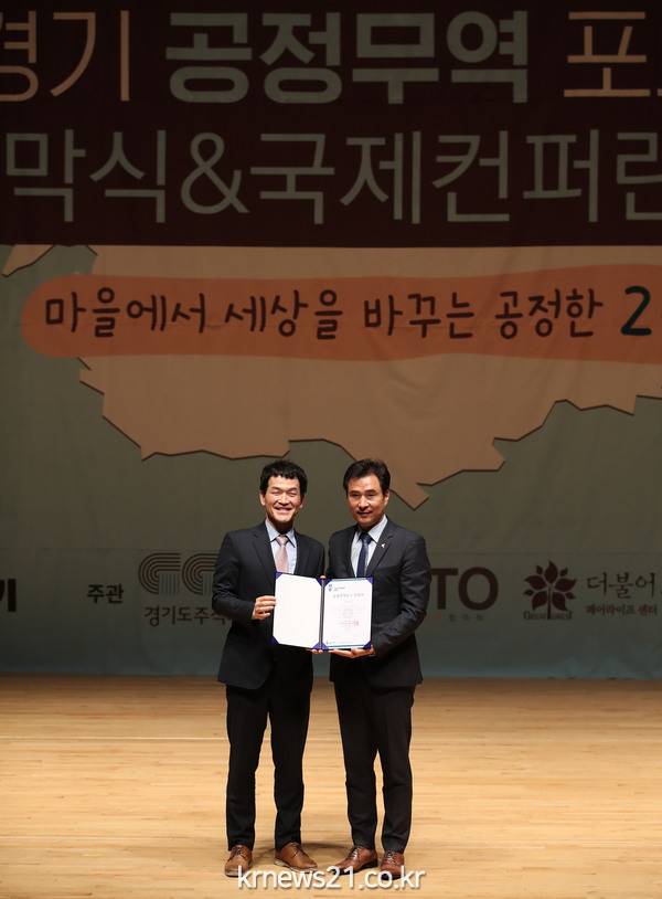 시는 29일 동탄 복합문화센터에서 개최된 ‘2018 경기 공정무역 국제 컨퍼런스 개막식’에서 국제 공정무역 마을위원회로부터 공식 인증을 획득하고 인증서와 현판을 전달받았다.