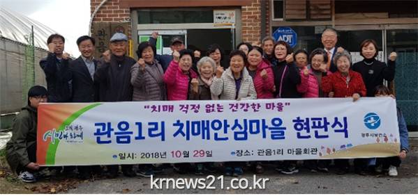 광주시보건소(소장 서근익)는 지난 29일 퇴촌면 관음1리를 ‘치매 안심마을’로 지정하고 관음1리 경로당에서 현판식을 개최했다.