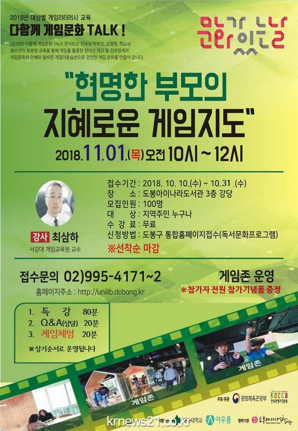 ▲ (사진=도봉구청)도봉구(구청장 이동진)는 오는 11월 1일 도봉아이나라도서관에서 건전한 게임문화생활을 위한 ‘현명한 부모의 지혜로운 게임지도’를 주제로 특강을 진행한다.