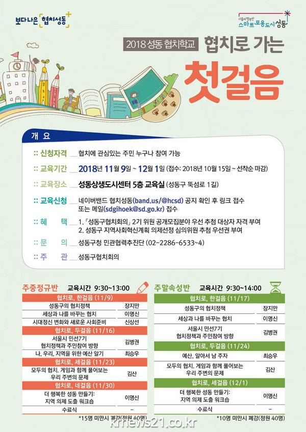 수강신청은 네이버밴드 협치성동(band.us/@hcsd)의 공지 링크 또는 메일(sdgihoek@sd.go.kr)을 통해 가능하며, 기타 자세한 사항은 기획예산과 민관협력추진단(02-2286-6533~4)으로 문의하면 안내받을 수 있다.