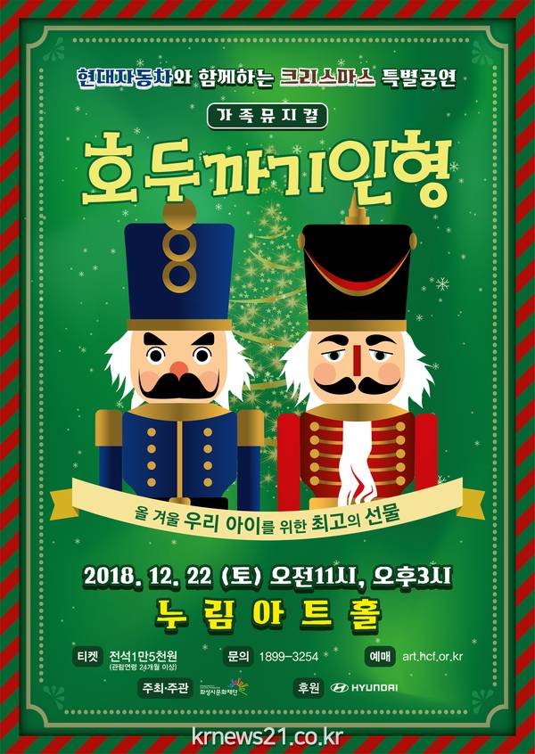 오는 12월 22일 토요일, 누림 아트홀에서는 크리스마스 특별기획공연으로 가족 뮤지컬 <</span>호두까기 인형>이 무대에 오른다. 크리스마스와 연말을 맞아 온 가족이 함께 추억을 만들 수 있는 따뜻한 시간을 만들어줄 예정이다.