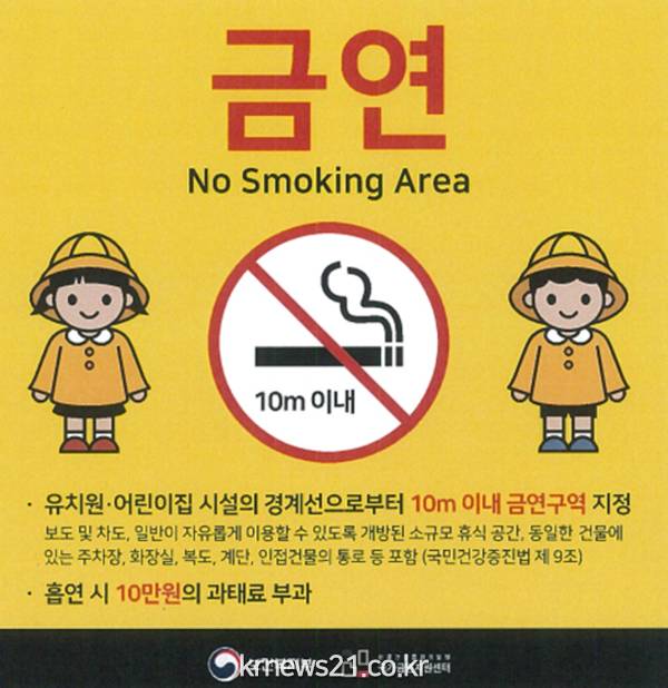 또한,「국민건강증진법」개정으로 2018.12.31부터 시행되는 어린이집 및 유치원 시설 경계선으로부터 10미터 이내 금연구역 확대 홍보 등을 적극 전개할 예정이다.