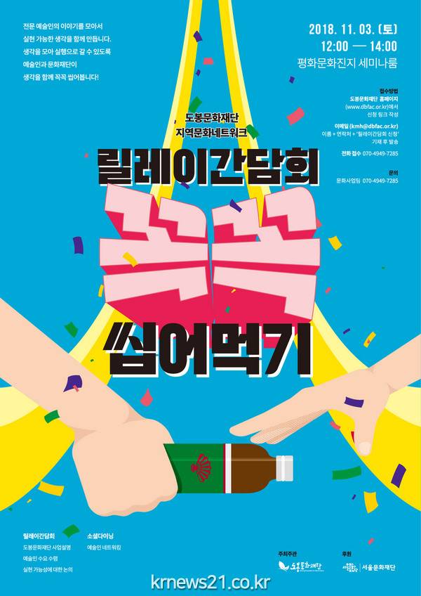 ▲ (사진=도봉구청)도봉구(구청장 이동진)는 오는 11월 3일 지역주민들과 지역예술가들이 한자리에 모여 도봉구만의 특색 있는 문화, 역사 자원들을 활용한 상생하는 지역문화사업에 대해 의견을 나누는 지역문화네트워크 릴레이간담회 ‘꼭꼭 씹어먹기’를 개최한다고 밝혔다.