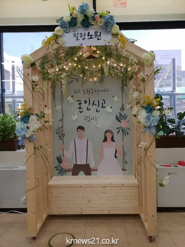 청사 1층 민원여권과에 설치된 포토존은 목재 프레임에 꽃장식을 하고 “우리 노원구청에서 혼인신고 했어요”라는 문구를 넣어 만들었다. 포토존에는 기념촬영을 위한 부케와 화관도 마련되어 있다.