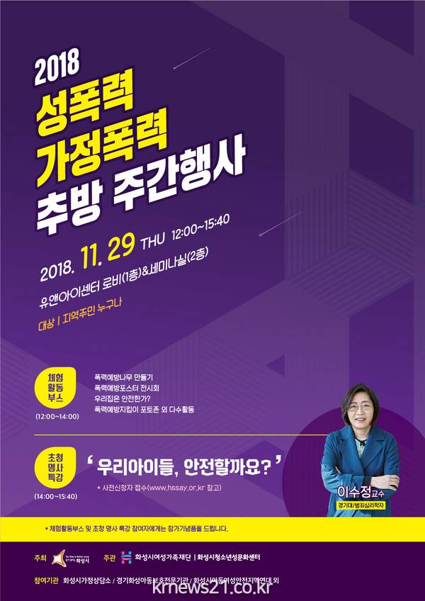 화성시 여성 가족재단 화성시 청소년성문화센터에서는 2018년 성폭력, 가정폭력 추방주간을 맞아 11월 29일 목요일 유앤아이센터에서 체험 활동 홍보 부스 진행과 명사특강을 진행한다. 이번 성폭력, 가정폭력 추방주간 행사는 화성시와 화성시 여성 가족재단이 주최하고 화성시 청소년성문화센터에서 주관하는 행사로, 화성시 아동 여성안전지역연대, 화성가정상담소, 화성시아동보호전문기관이 함께 참여하여 더욱 다채롭게 꾸며질 예정이다.