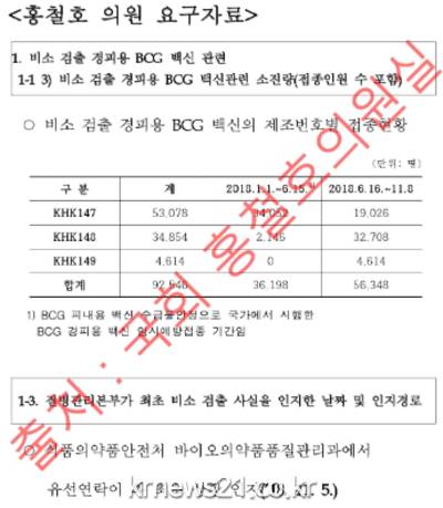 ▲ (사진=홍철호 의원실 제공)국회 자유한국당 홍철호 의원(경기 김포시을, 국토교통위원회)은 지난 7일 경피용 BCG(결핵예방) 백신에서 기준치를 초과하는 비소가 검출된 것이 국민들에게 발표된 가운데, 소관 기관인 식약처가 발표 이틀 전인 5일 비소 검출 사실을 이미 알고 있었다고 밝혔다.