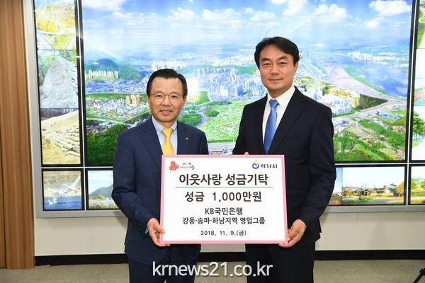 KB국민은행 강동·송파·하남지역영업그룹(대표 박형수)은 9일 하남시(시장 김상호)에 이웃돕기 성금 1천만원을 기탁했다. 이날 김상호 하남시장, 박형수 대표 등 관계자들이 참석해 시장실에서 기탁식을 가졌다.