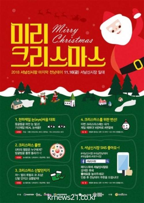 지난달 할로윈데이에 이은 ‘미리크리스마스데이’ 행사는 매월 진행하는 서남신시장 천냥데이 행사의 일환으로, 크리스마스를 한 달 앞두고 있는 시점에서 ‘미리’크리스마스 분위기를 느낄 수 있다.