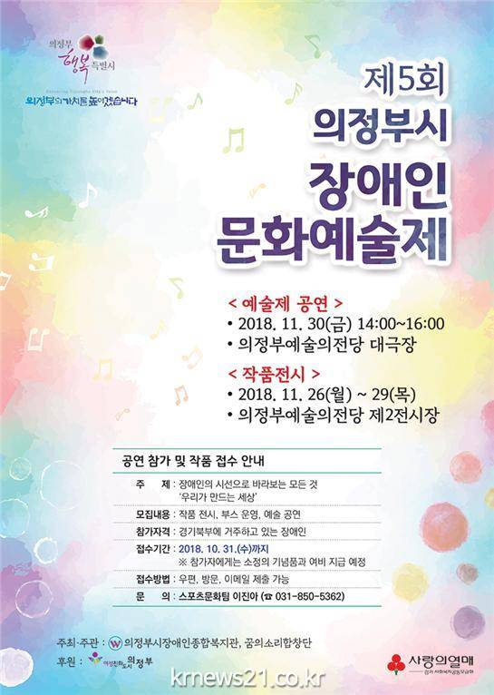 한국지체장애인협회 의정부시장애인종합복지관에서는 11월 26일부터 11월 30일까지 의정부예술의전당에서 ‘제5회 의정부시장애인문화예술제’를 개최한다.