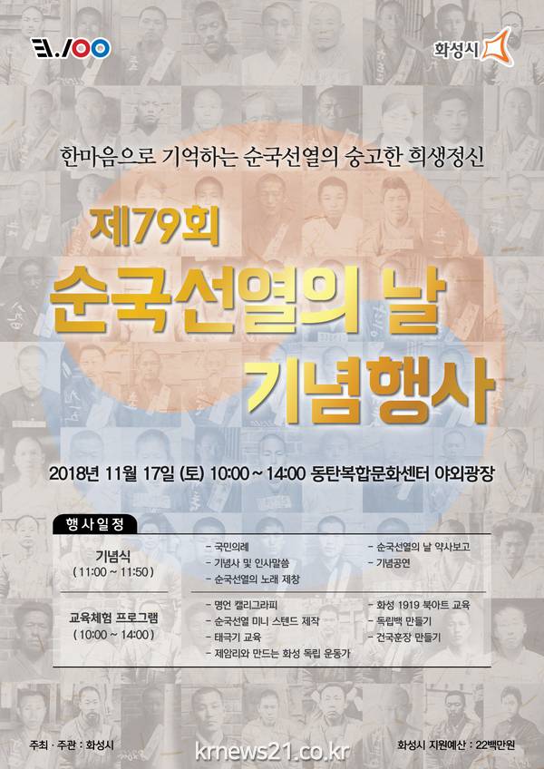 화성시가 제79회 순국선열의 날을 맞아 오는 17일 동탄 복합문화센터에서 기념행사를 개최한다.