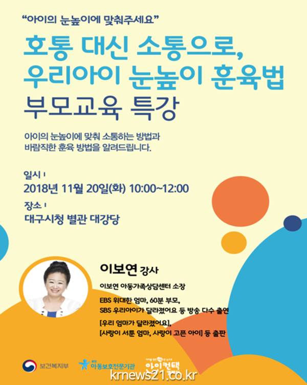 ▲ (사진=대구광역시청)11.20.(화)에는 자녀훈육에 시행착오와 어려움을 겪는 부모들을 위해 ‘호통 대신 소통으로, 우리아이 눈높이 훈육법’이란 주제로 부모교육 특강을 준비했다.