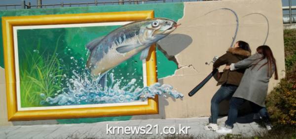 성남시(시장 은수미)는 최근 2000만 원을 들여 이곳에 강물 속 물고기 낚시를 트릭아트(Trick art)로 표현한 30m(높이 2m) 길이의 벽화를 그렸다.
