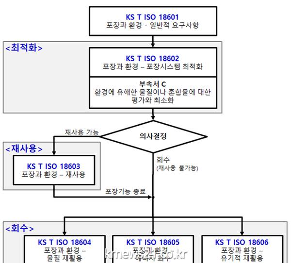 특히 '포장 시스템 최적화(KS T ISO 18602)'는 '일반적 요구사항(KS T ISO 18601)'을 기반으로 포장재의 안정성 확보 및 포장재의 무게·부피를 최소화하는 요건이 명시되어 있다.