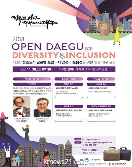 ▲ (사진=대구광역시청)대구시와 포럼 창조도시를 만드는 사람들(이하 포럼 창조도시)은 시민중심의 창조적 도시문화를 확산하기 위해 11.30.(금) 오전 10시부터 노보텔 앰배서더대구에서 ‘창조도시 글로벌 포럼(이하 글로벌 포럼)’을 개최한다.