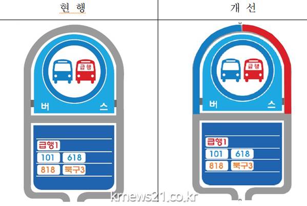 또한, 급행버스가 정차하는 승강장은 푸른색과 붉은색 시내버스 표시가 부착되어 있으나, 급행버스는 2개 승강장 중 1개 승강장에만 정차하므로 원거리에서는 급행버스가 정차하는지 여부를 알기에 어려움이 있다는 지적에 따라, 전체 급행버스 정차 승강장 폴대 상단부에 붉은색 표지를 부착하여 시인성을 개선한다.