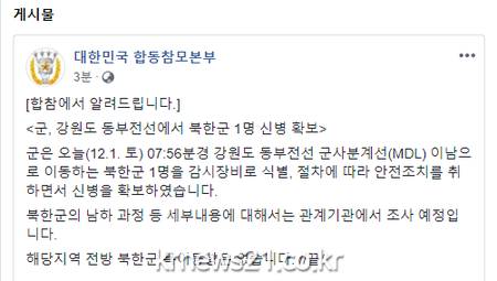 합동참모본부는 오늘(12월1일) 오전 7시 56분경 강원도 동부전선 군사분계선(MDL)을 넘어 온 북한군 1명의 신병을 확보했다고 밝혔다.