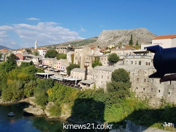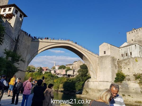 모스타르 다리전경. 15,16세기 오스만국의 전초 기지로 건설되어 19,20세기 오스트리아 헝기리 제국시대에 크게 발전된 도시다.