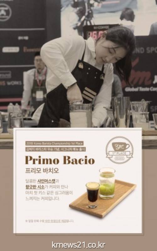 ‘프리모 바치오’는 바리스타 대회를 위해 개발된 시그니처 메뉴로 케냐 핸디지 AA TOP으로 추출한 에스프레소에 샤인 머스켓 포도와 일본 깻잎으로 불리는 시소, 리치 주스를 더해 만든다. 해당 메뉴는 첫 키스라는 의미로 샤인 머스켓과 시소가 커피와 만나 엘더플라워 같은 화사한 향미가 느껴지며 달콤한 맛과 싱그러운 느낌이 첫 키스를 떠오르게 한다.