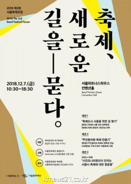서울문화재단(대표이사 김종휘)이 ‘2018 제3회 서울축제포럼’을 12월 7일(금) 오전 10시 30분부터 오후 6시 30분까지 서울파트너스하우스에서 개최한다.
