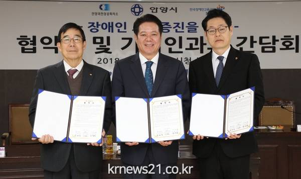 안양시(시장 최대호)는 3일 안양과천 상공회의소(회장 이상호)와 한국장애인고용공단 경기지사(지사장 홍성훈) 등 3개 기관 간 장애인 고용증진을 위한 협약을 체결했다고 밝혔다.