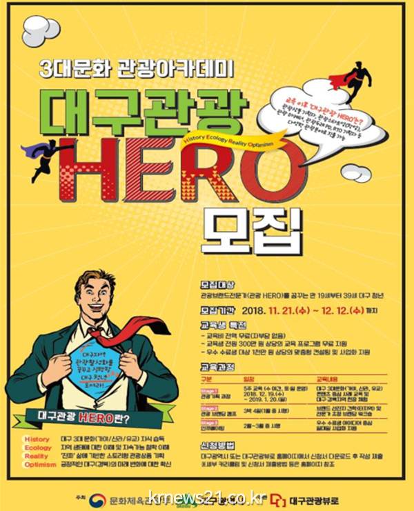대구시 제갈진수 관광과장은 “이번 관광아카데미를 통해 지역이 보유하고 있는 신라·가야·유교 문화와 생태자원을 활용한 문화관광 상품 기획 등 관광부문의 전문가 ‘대구관광 HERO’를 육성하고자 한다”며, “지역 역사문화와 관광에 관심있는 청년들의 많은 참여를 바라며, 미래를 이끌어갈 청년이 주도하는 관광환경이 구축될 수 있도록 수준 높은 다양한 커리큘럼을 마련하여 지원하겠다”고 말했다.