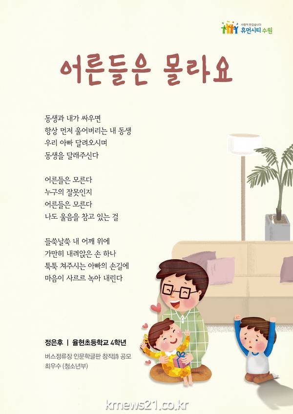 수원시 ‘제12회 버스정류장 인문학 글판’ 공모에서 정은후 학생(율현초 4)의 ‘어른들은 몰라요’와 이선주 씨(수원 팔달구)의 ‘햇살을 걷다’가 각각 청소년부·일반부 최우수작으로 선정됐다.
