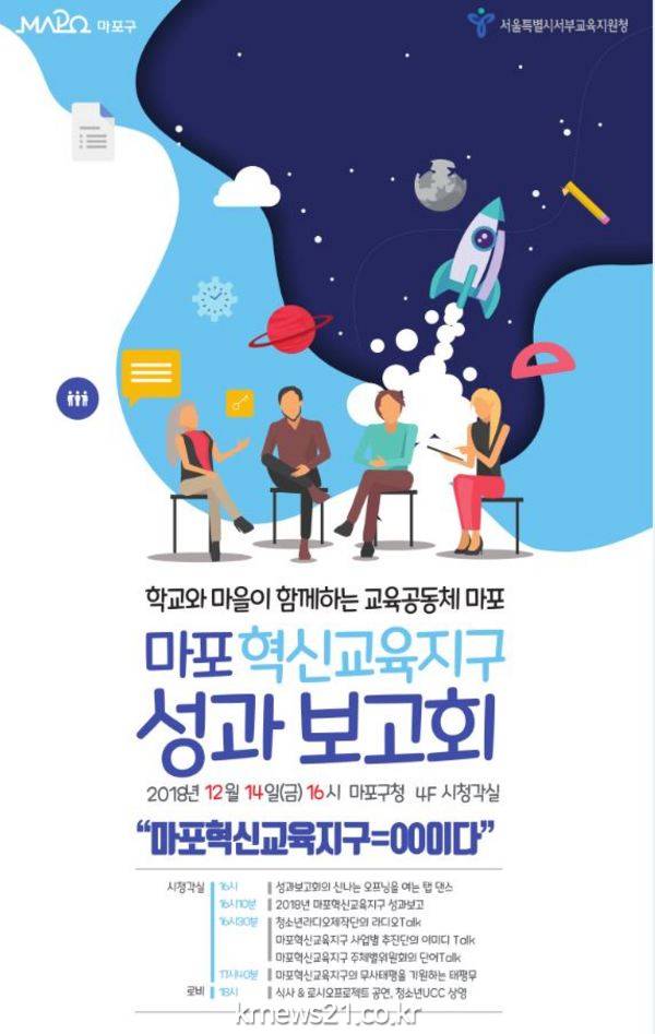마포구(구청장 유동균)는 오는 14일(금) 오후 4시, 마포구청 4층 시청각실에서 ‘2018 마포혁신교육지구 성과보고회’를 개최한다고 밝혔다.