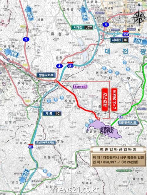 평촌산단 진입도로 개설공사는 총사업비 390억 원을 들여 서구 평촌동(평촌일반산업단지) ~ 유성구 방동 (국도4호선)까지 3.0㎞구간에 대해 왕복 2차로(폭 10m) 도로를 개설하는 사업으로, 지난 11월 29일 사업노선 확정 및 총사업비 조정을 승인 받았다.