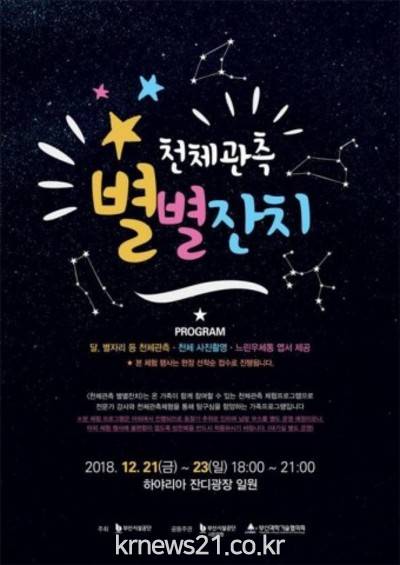 부산시설공단(이사장 추연길)은 21일부터 23일까지 3일간 부산시민공원 하야리아 잔디광장 일원에서 겨울밤 천체관측 별을 볼 수 있는 ‘별별잔치’ 체험 프로그램 행사를 개최한다고 밝혔다.