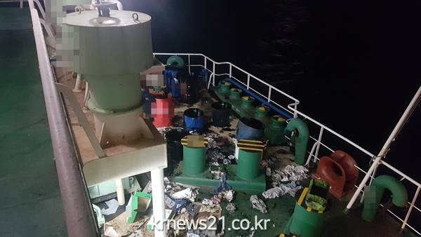 벙커-C 유가 선체 갑판상 넘쳐 흘러, 선원들이 톱밥을 뿌리는 등 자체 방제작업을 하고 있는