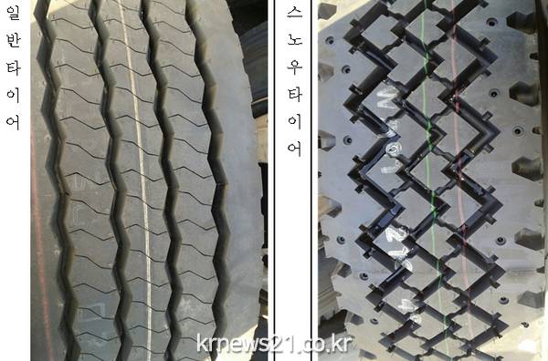 스노우타이어는 타이어 홈이 많으며 일반 타이어와 비교해 빙판 운행에는 큰 차이가 없으나, 눈이 내리기 시작하여 빙판이 되기 이전까지는 운행이 가능할 정도로 제동력이 우수하다.