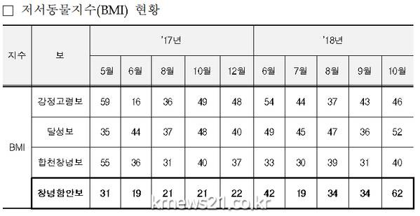 창녕함안보에서는 저서동물지수가 증감을 반복해 오다 올해 10월 보 개방 후 급증하였으며, 특히 오염에 민감한 동양하루살이, 등딱지하루살이 등이 신규 확인되었다.