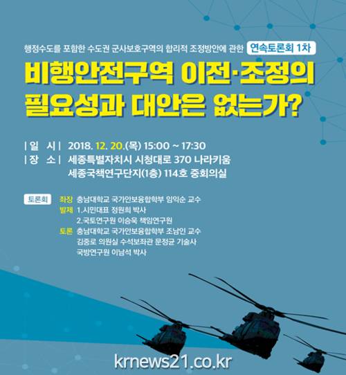 ▲ (사진=김중로 의원실)바른미래당 세종특별자치시 위원장, 그리고 국회미래안보포럼 대표인 김중로 의원은 국책연구기관이 모여 있는 나라키움 세종 국책연구단지(1층)에서 행정수도 내 조치원비행장 항공대대 통합·이전(이하 ‘항공대대’이라고 한다.)을 주제로 토론회를 개최했다.