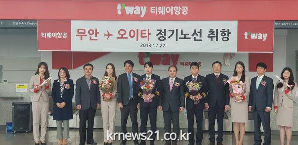 무안군(군수 김산)은 “티웨이항공이 22일 무안국제공항에서 첫 국제선 기타큐슈 취항에 이어 오이타행 국제 정기선을 띄웠다.”고 밝혔다.
