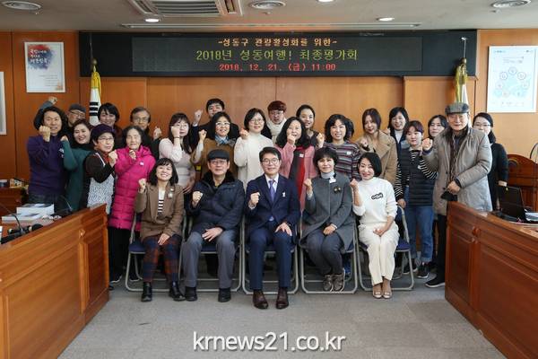 성동구(구청장 정원오)는 지난 12월 21일 오전 11시 구청 8층 대회의실에서 지속가능한 관광 발전을 위한 다양한 의견 나눔과 우수활동자 격려를 위해 주민과 함께하는 ‘2018 성동 여행 평가회 및 토론회’를 개최했다.