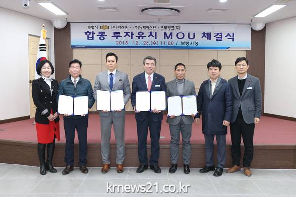 보령시는 26일 오전 시청 중회의실에서 김동일 시장과 이규현 ㈜라즈온 대표, 설진표 ㈜뉴페이스원 회장, 황석희 오투뱅크㈜ 대표 등 관계자가 참석한 가운데 3개 기업과의 합동 투자양해각서를 체결했다.