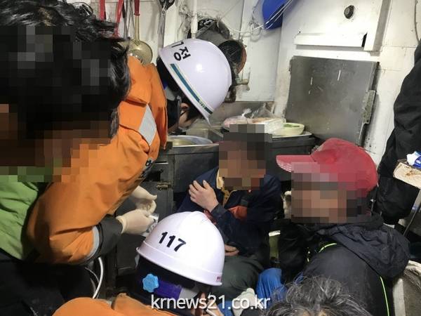 등 4명이 타박상과 찰과상을 입어 경비정에서 응급치료를 하였으며, 생명엔 지장이 없는