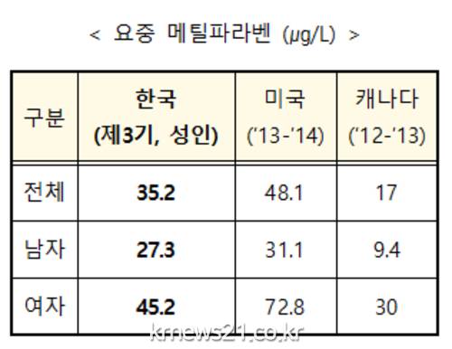제3기 기초조사부터 추가된 파라벤류(메틸-, 에틸-, 프로필-) 중 화장품, 개인위생용품 등에 살균성 보존제로 많이 사용되는 메틸파라벤은 성인의 경우 여성(45.2㎍/L)이 남성(27.3㎍/L)보다 높게 나타났으며, 이는 국외 결과와 유사한 경향을 보였다.