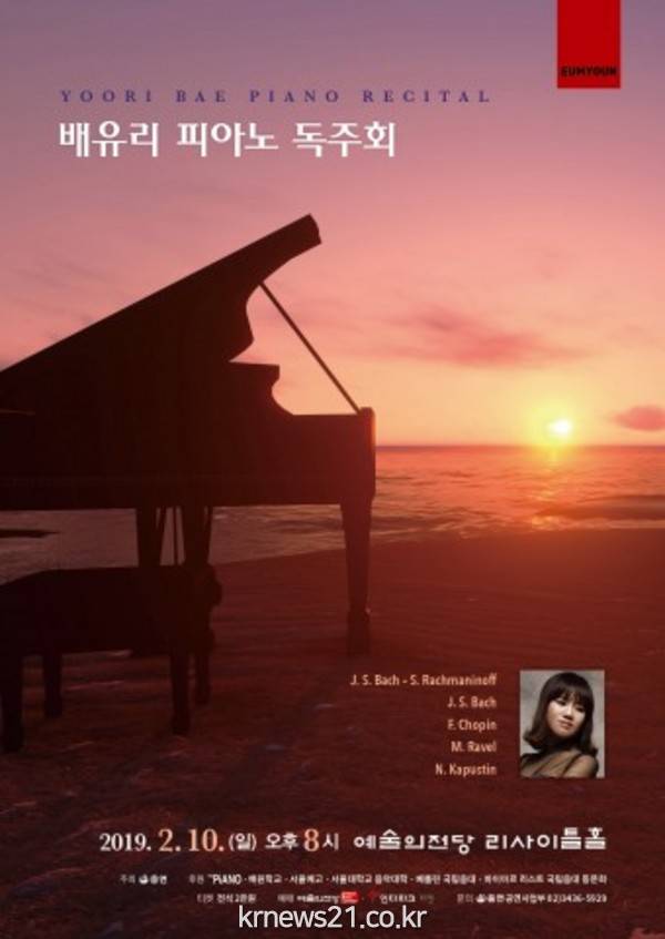 배유리 피아노 독주회가 2월 10일(일) 오후 8시 예술의전당 리사이틀홀에서 진행된다. 이번 독주회는 J. S. Bach - S. Rachmaninoff, J. S. Bach, F. Chopin, M. Ravel, N. Kapustin의 작품들로 관중들을 찾아갈 예정이다.
